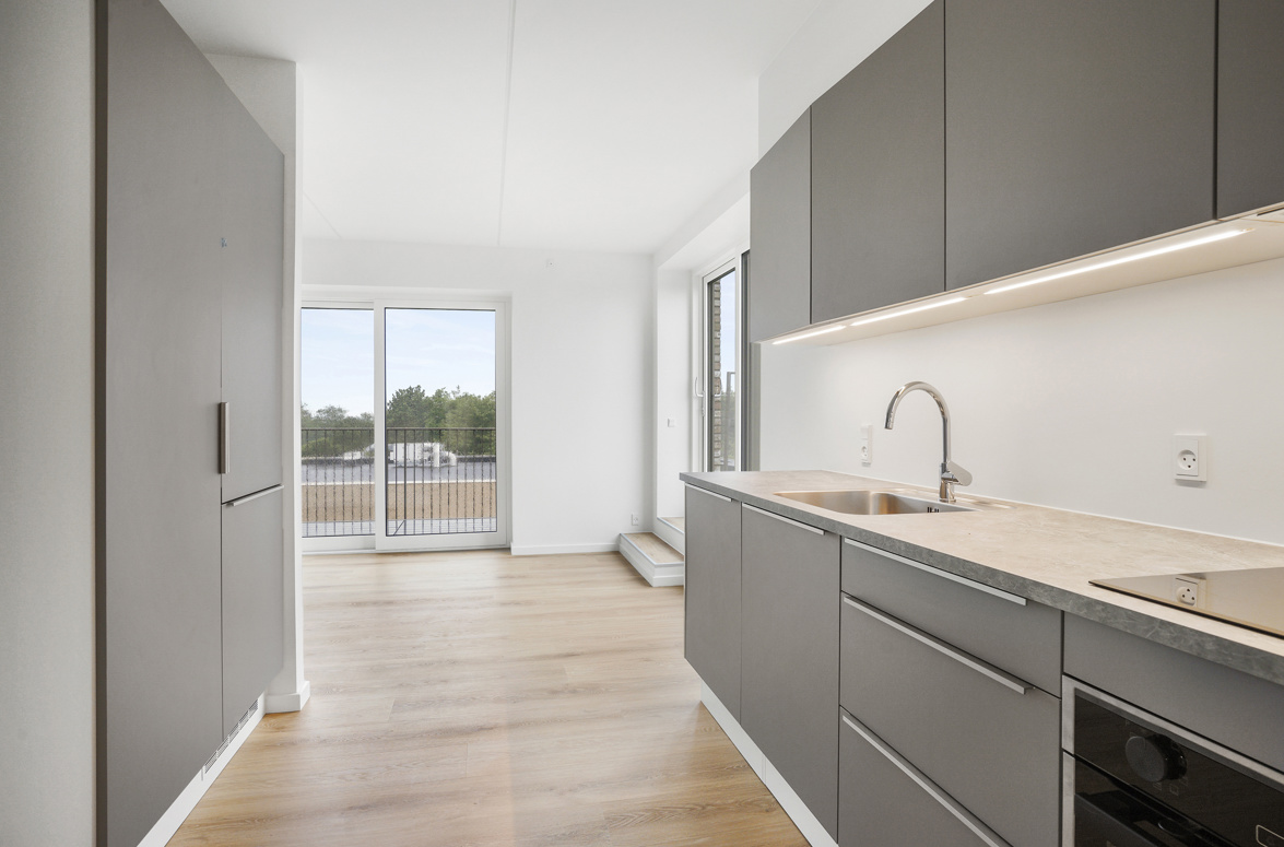 Lejlighed på 63m2 med en 5m2 altan og en imponerende 12m2 terrasse. Det rummelige køkkenalrum og den gode planløsning gør den til det perfekte hjem.